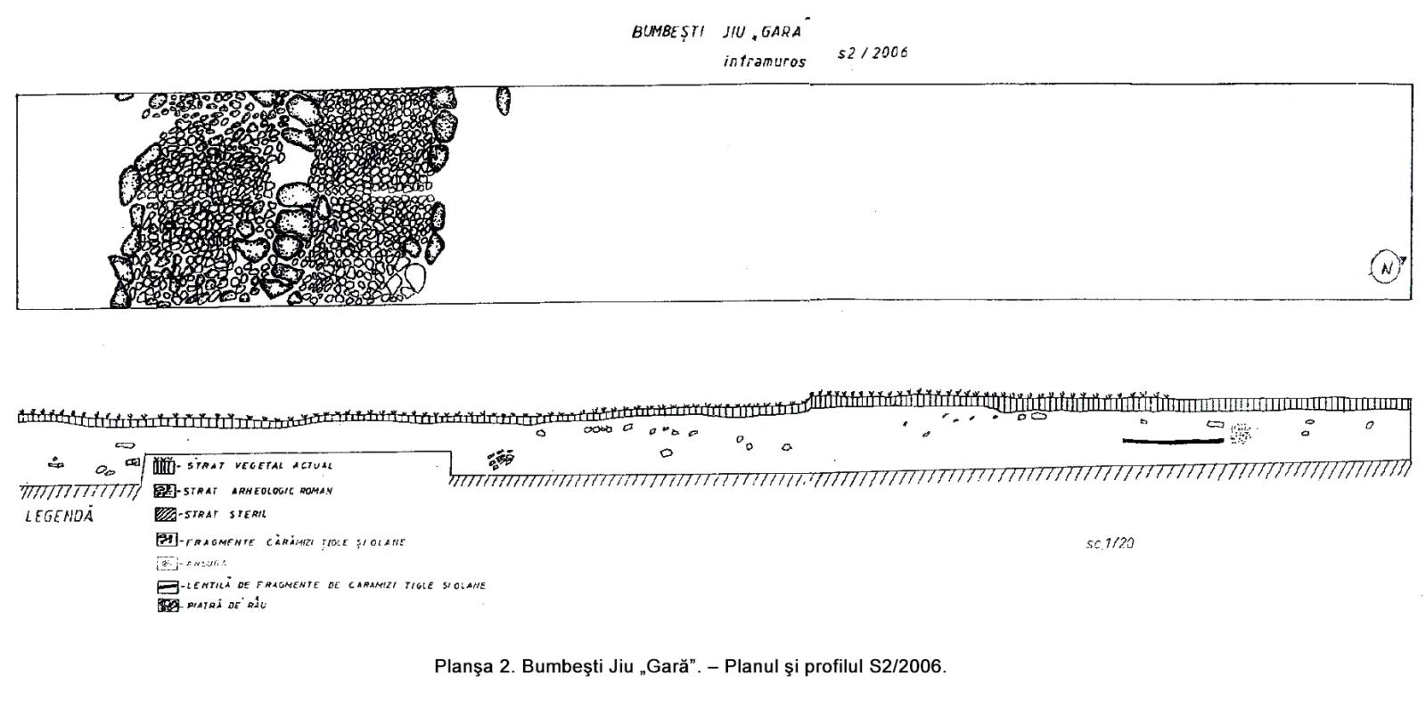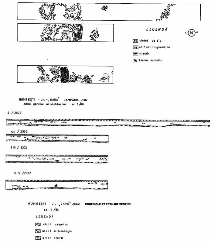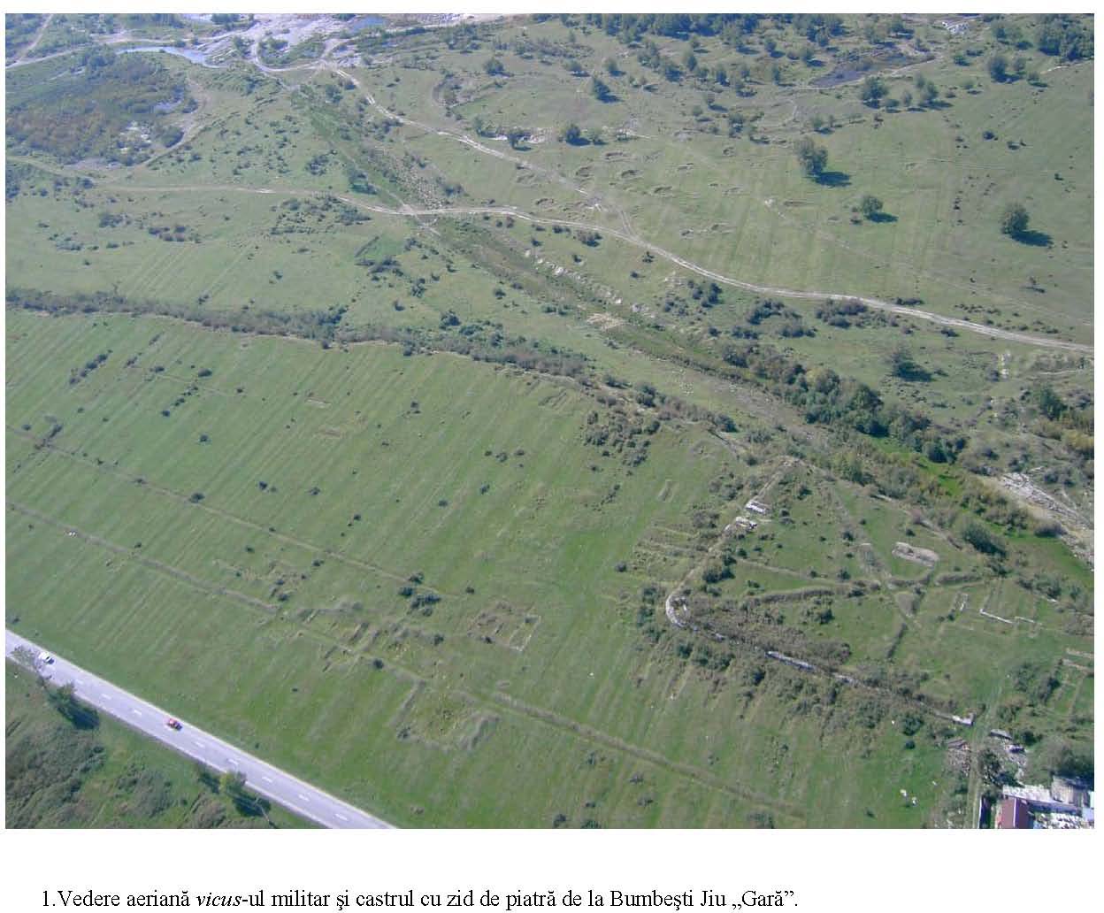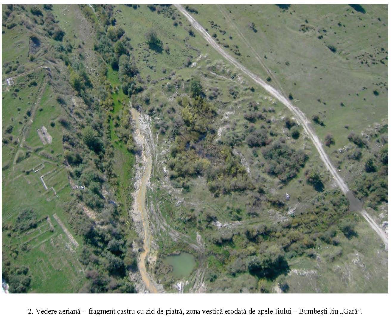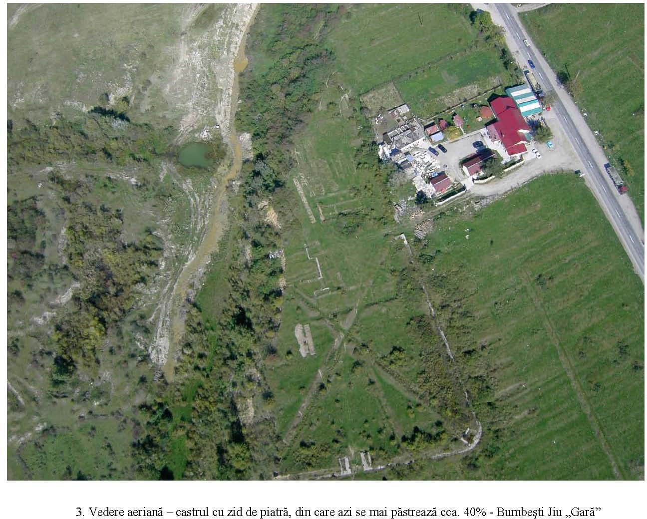 Mai mult de jumătate din suprafaţa castrului a fost distrusă de apele Jiului. Din el se mai păstrează astăzi doar 76,60 m din latura sudică şi latura estică de 168,80 m. Materialul arheologic rezultat constă din piese de armament (vârfuri de suliţe şi lănci), o calotă de coif roman, numeroase fragmente ceramice, cărămizi ştampilate, monede.